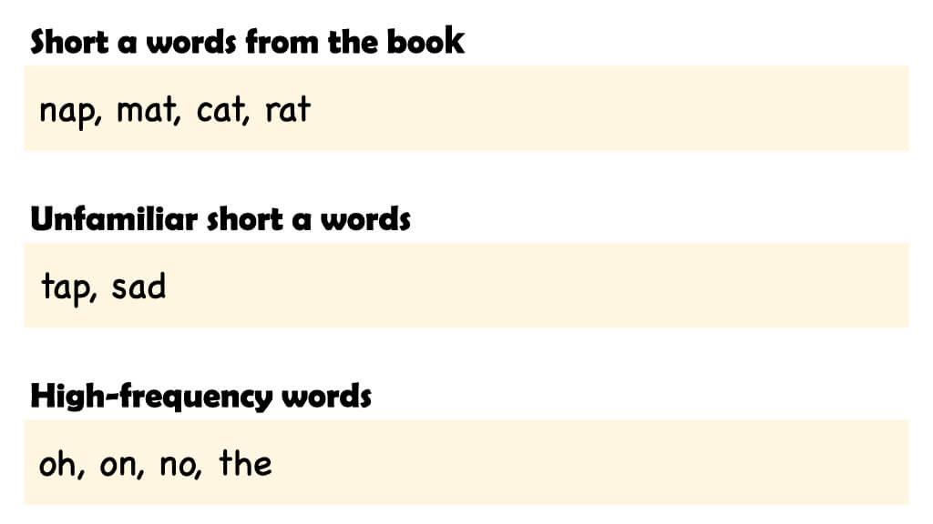 • CVC Words: nap, mat, tap, sad, cat, rat